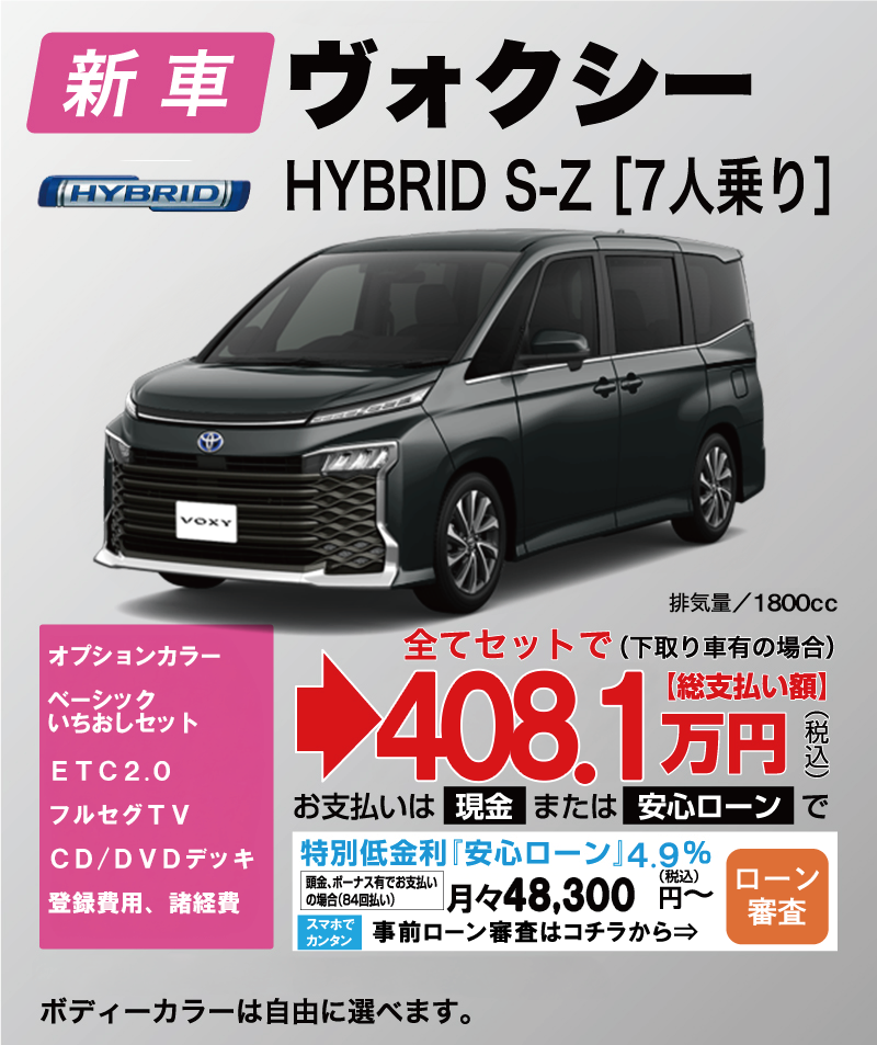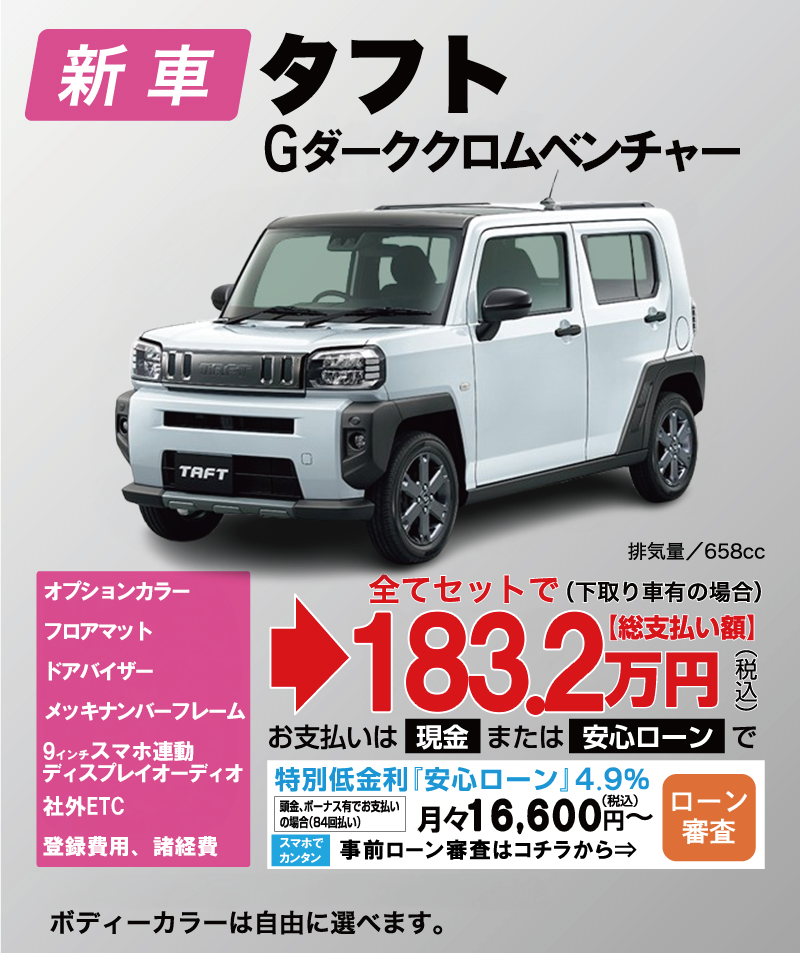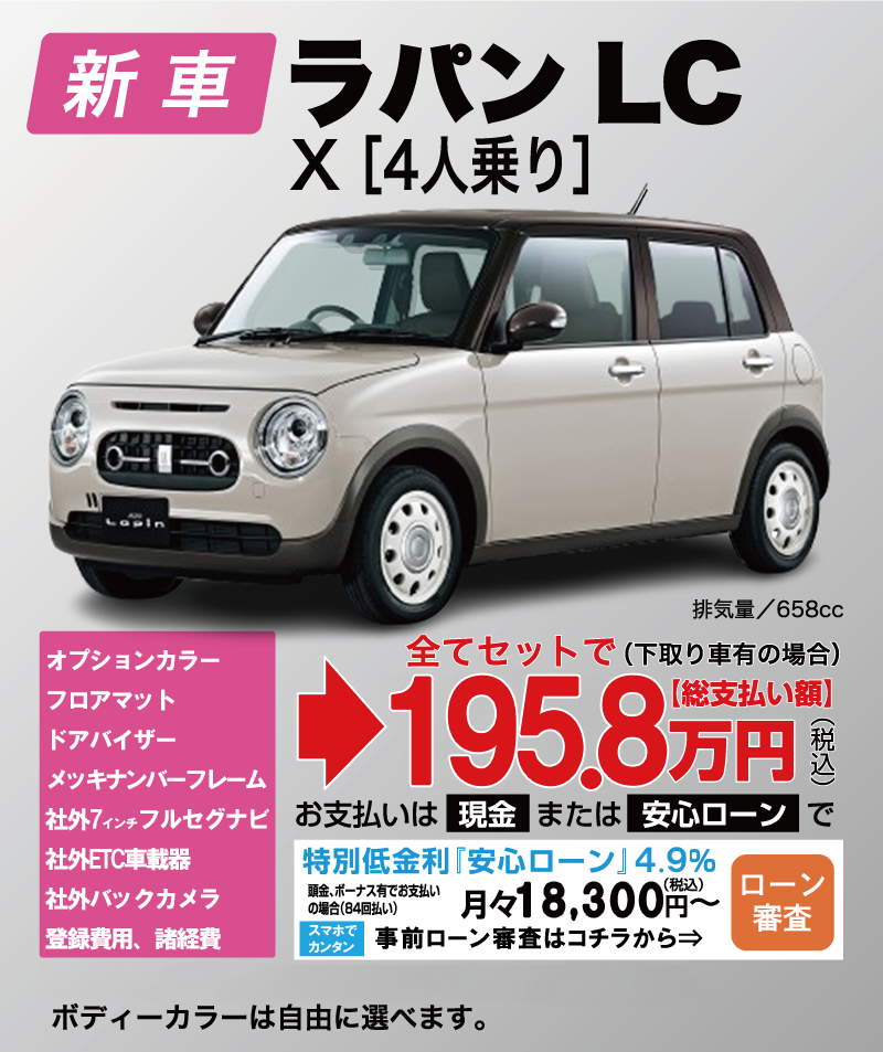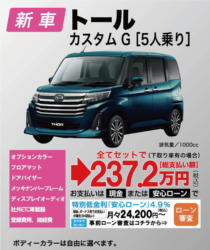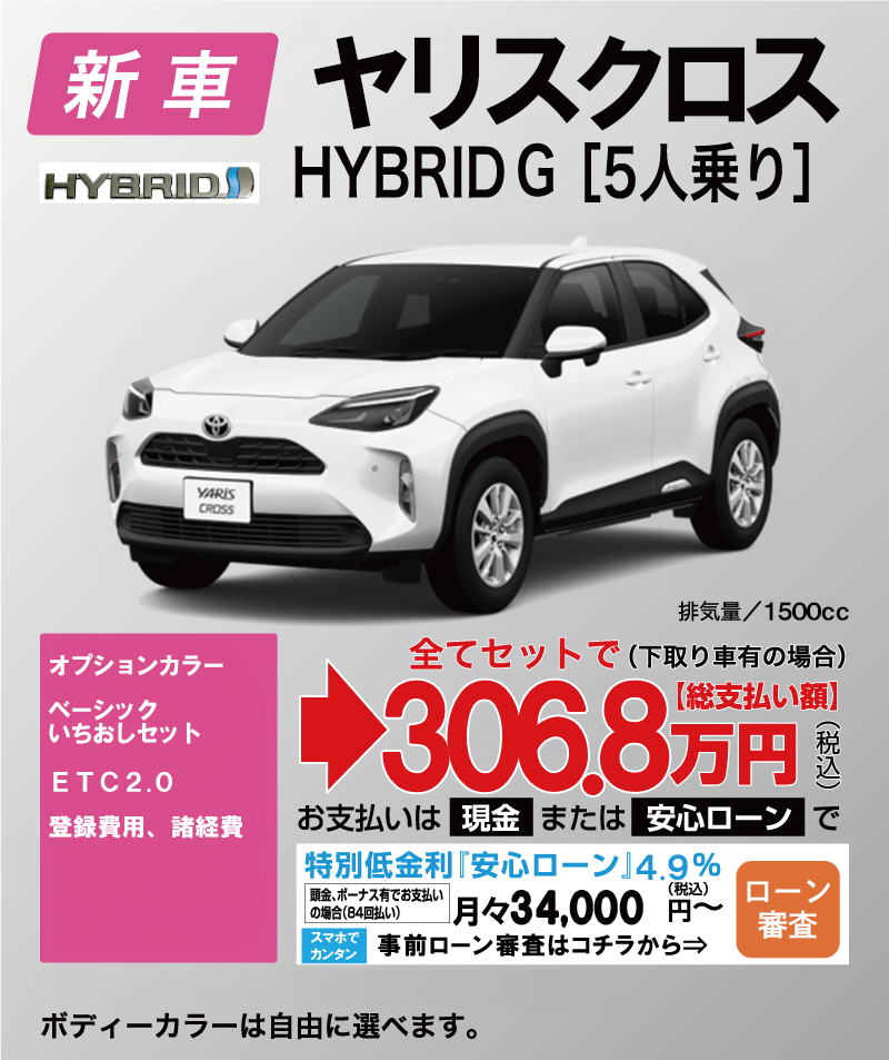 「車はオプションや諸経費が高くて不安を感じている」お客様におすすめのメニューです。新車を検討されるお客様の多くが、セットで購入したいオプション・登録費用・諸経費・税金等が全てセットになっていますので、大変お得になっております。新車をお得に、より安く買いたい方におすすめです。下取り車はどんなに低年式でも過走行でも構いません。